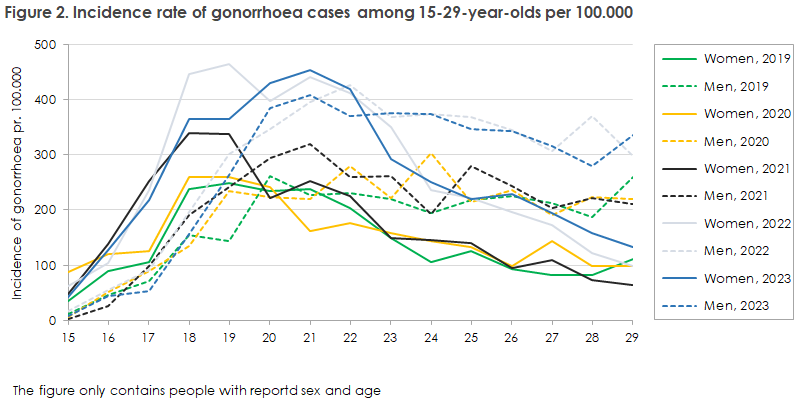 In 2023, a decrease in the incidence rate was seen among young women (17-19-year-olds); otherwise, no significant changes were seen since 2022 for the 15-29 age group, for either men or women, Figure 2.