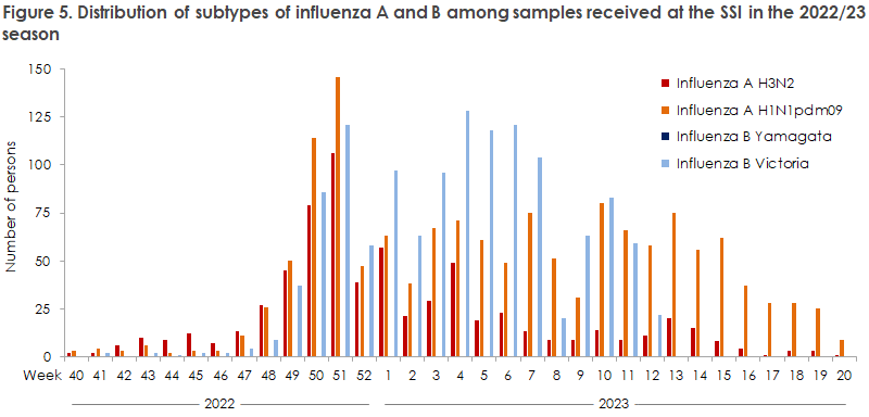 In the course of the season, the National Danish WHO Influenza Centre at SSI received a total of 9,140 samples for testing and characterisation of influenza viruses circulating during the season.